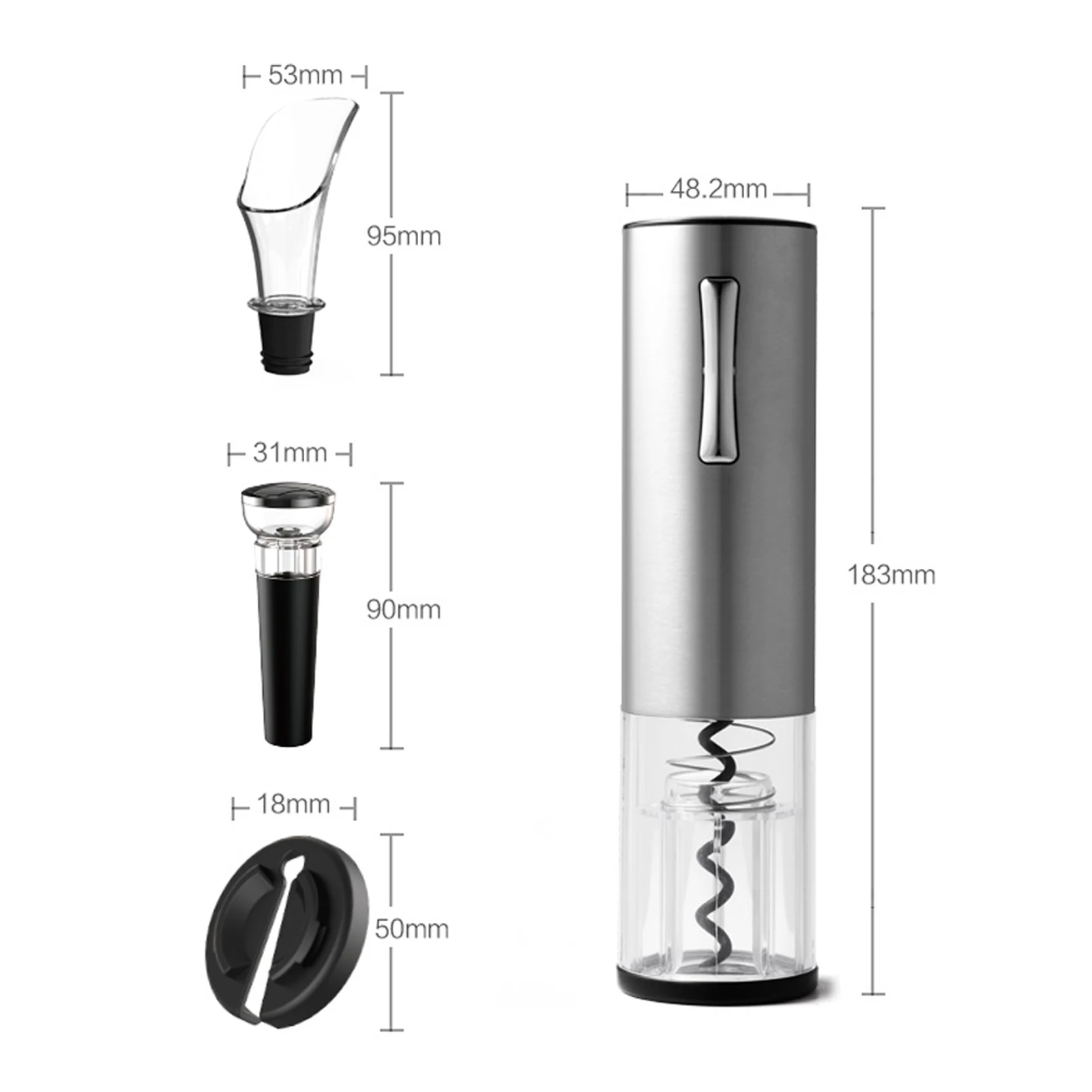 Электрический штопор привлекает своей функциональностью и внешним видом. Этот штопор работает от аккумулятора. Выполнен из нержавеющей стали с мощным мотором. Работа электрического штопора стабильна и эффективна. Без лишних усилий, используя винный штопор вы откроете бутылку с разными видами пробки: синтетической или деревянной. Время открытия бутылки - 6 секунд. Многофункциональный нож для удобного снятия фольги на бутылке удобно фиксируется в основании штопора.
